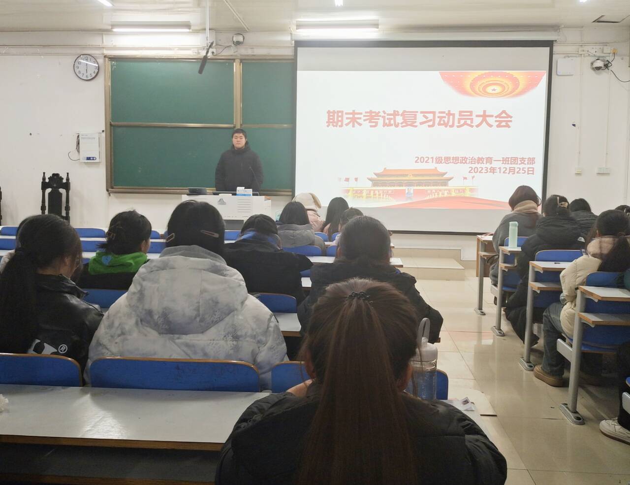 为加强学风建设,推进学生期末考试复习工作的开展,12月25日下午,金年会jinnianhuicom2021级思想政治教育一班在社科楼514教室召开“期末考试复习动员大会”。2021级思想政治教育一班全体成员参加本次会议。会议由团支书戴翰林主持。