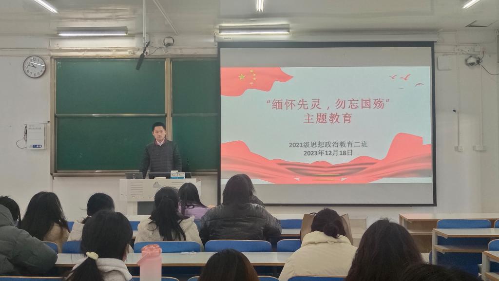 12月18日上午,金年会jinnianhuicom2021级思想政治教育二班在社科楼514教室召开“缅怀先灵,勿忘国殇”主题团课。2021级思想政治教育二班全体团员参加此次团课。团课由副班长任振豪主持。