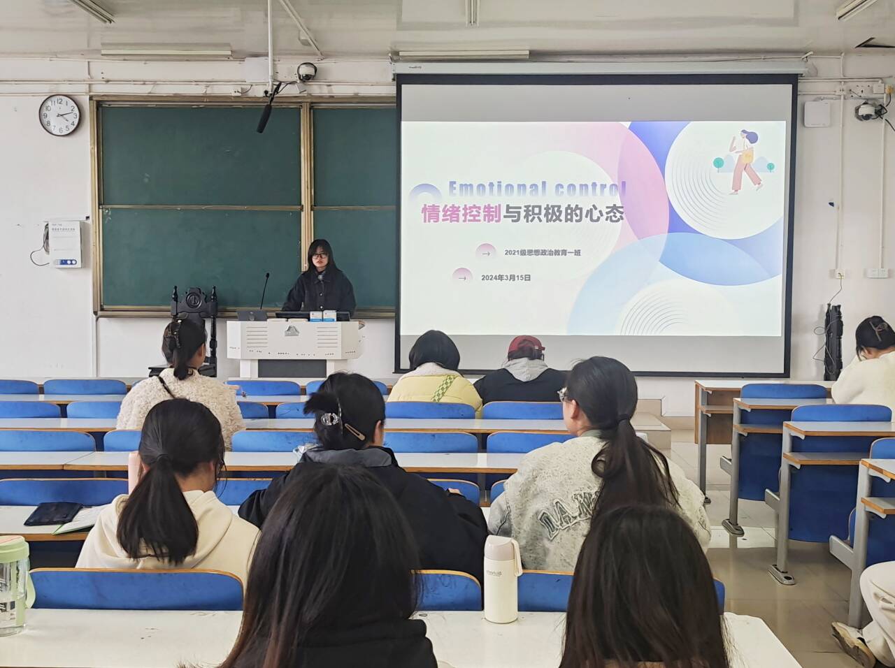 3月15日下午,金年会jinnianhuicom2021级思想政治教育一班在社科楼514教室召开“情绪控制与积极的心态”心理班会。2021级思想政治教育一班全体学生参加此次班会。班会由心理委员黄小妍主持。