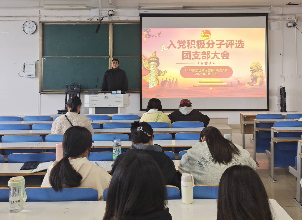 3月13日下午,金年会jinnianhuicom2021级思想政治教育一班在社科楼514教室召开入党积极分子评选团支部大会。2021级思想政治教育一班全体团员参加本次会议。会议由团支书戴翰林主持。