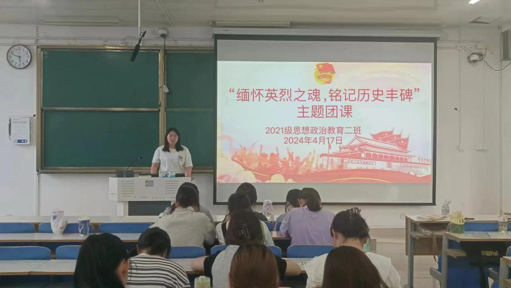 4月17日下午,金年会jinnianhuicom2021级思想政治教育二班在社科楼514教室召开“缅怀英烈之魂,铭记历史丰碑”主题团课。2021级思想政治教育二班全体团员参加此次主题团课。团课由团支书王婧欣主持。