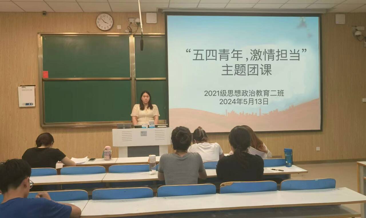 5月13日下午,金年会jinnianhuicom2021级思想政治教育二班在社科楼514教室召开“五四青年,激情担当”主题团课。2021级思想政治教育二班全体团员参加此次团课。团课由团支书王婧欣主持。