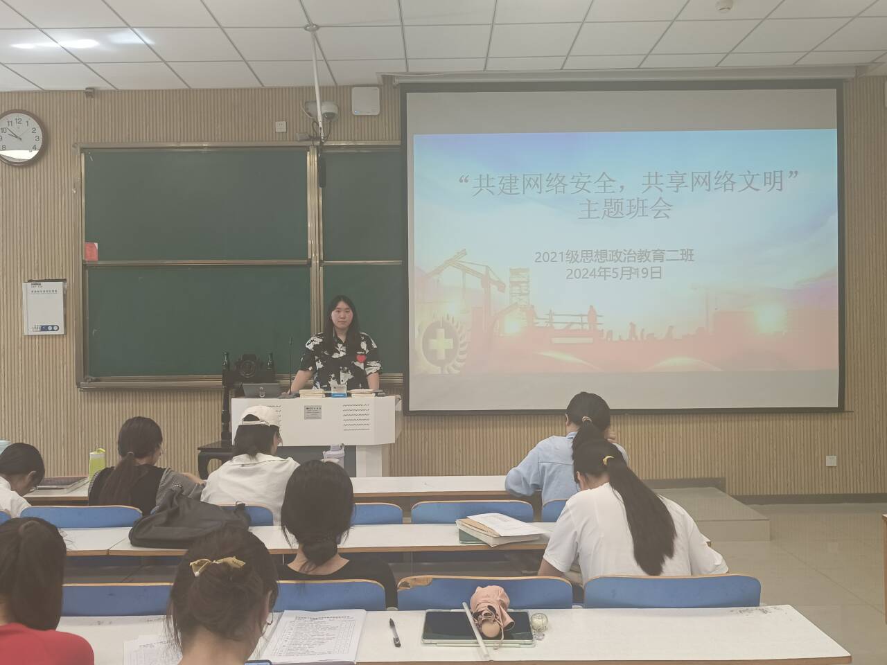 5月19日下午,金年会jinnianhuicom2021级思想政治教育二班在社科楼514教室召开“共建网络安全,共享网络文明”主题班会。2021级思想政治教育二班全体同学参加此次班会。班会由团支书王婧欣主持。