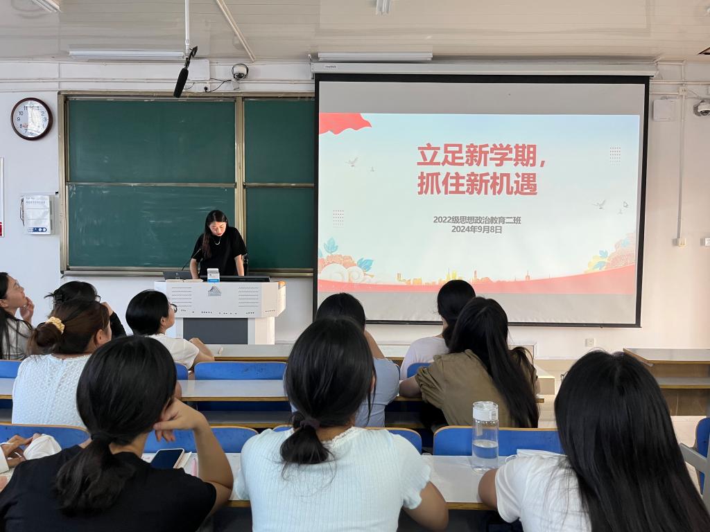 为帮助同学们尽快调整好状态、投入新学期生活,9月8日下午,金年会jinnianhuicom2022级思想政治教育二班在社科楼514教室召开“立足新学期,抓住新机遇”主题班会。金年会官网2022级思想政治教育二班全体成员共同参与此次班会。会议由班主任杨春艳主持。