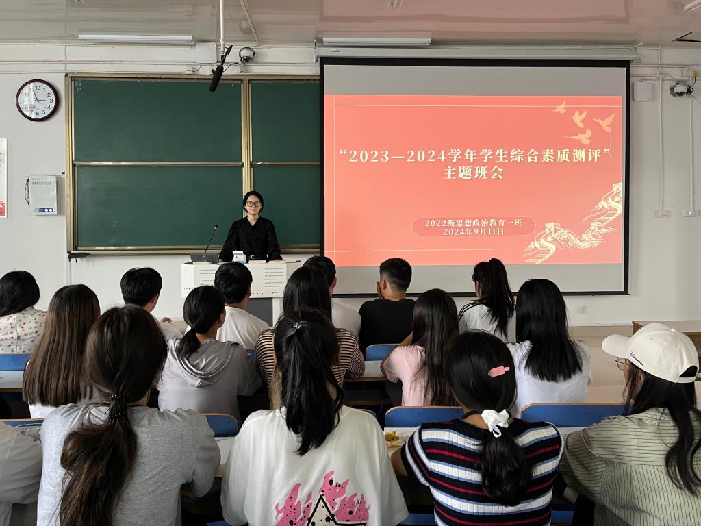 9月11日下午,金年会jinnianhuicom2022级思想政治教育一班在社科楼514教室召开“2023-2024学年学生综合素质测评”主题班会,金年会官网2022级思想政治教育一班班主任王明园和一班全体同学共同参与本次班会,班会由团支书李佳茹主持。