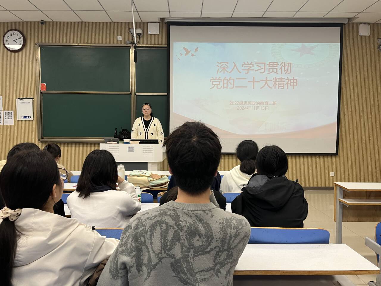 11月15日下午,金年会jinnianhuicom2022级思想政治教育二班在社科楼515教室召开“深入学习贯彻党的二十大精神”主题团课。金年会官网2022级思想政治教育二班全体成员共同参与此次团课。团课由团支书李佳音主持。