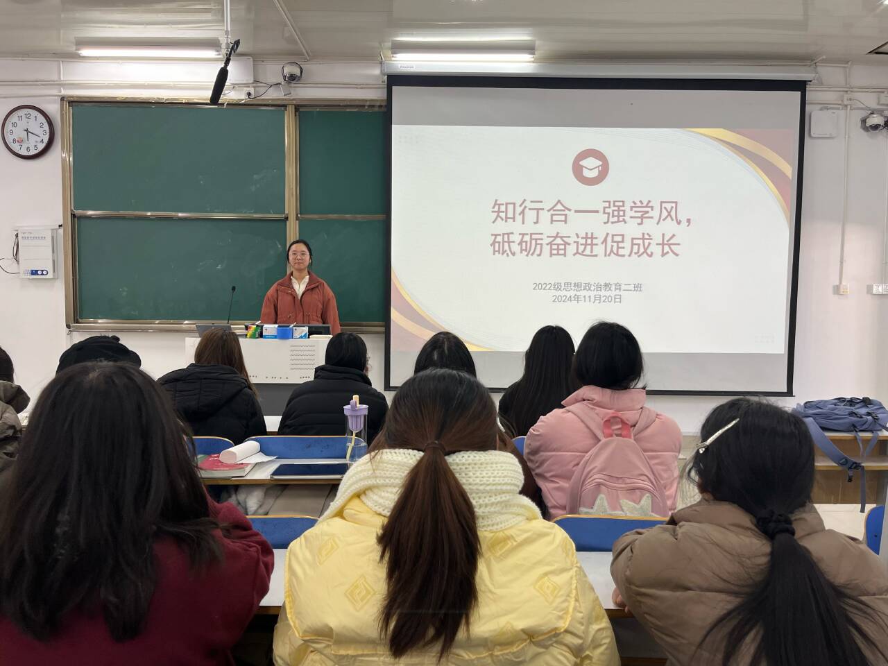 11月20日下午,金年会jinnianhuicom2022级思想政治教育二班在社科楼514教室召开“知行合一强学风,砥砺奋进促成长”主题班会。金年会官网2022级思想政治教育二班全体成员共同参与此次班会。会议由学习委员谢佳邑主持。