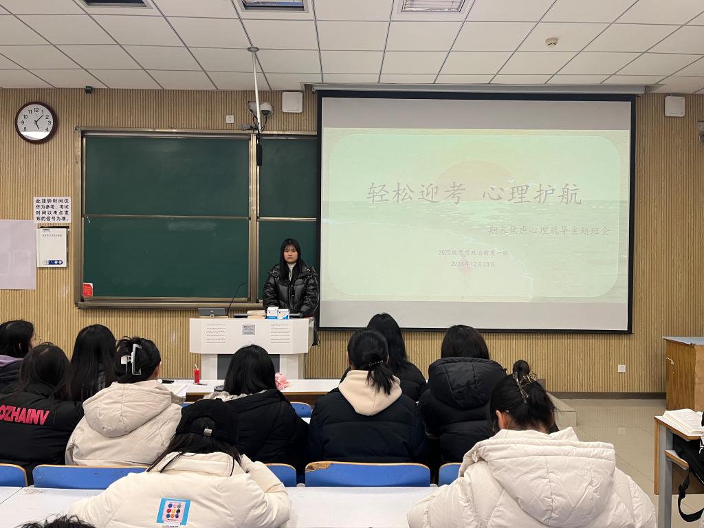 为帮助同学们调整考试心态,12月23日下午,金年会jinnianhuicom2022级思想政治教育一班在社科楼515教室开展“轻松迎考,心理护航”主题班会。金年会官网2022级思想政治教育一班全体同学共同参与本次班会,班会由心理委员马思源主持。