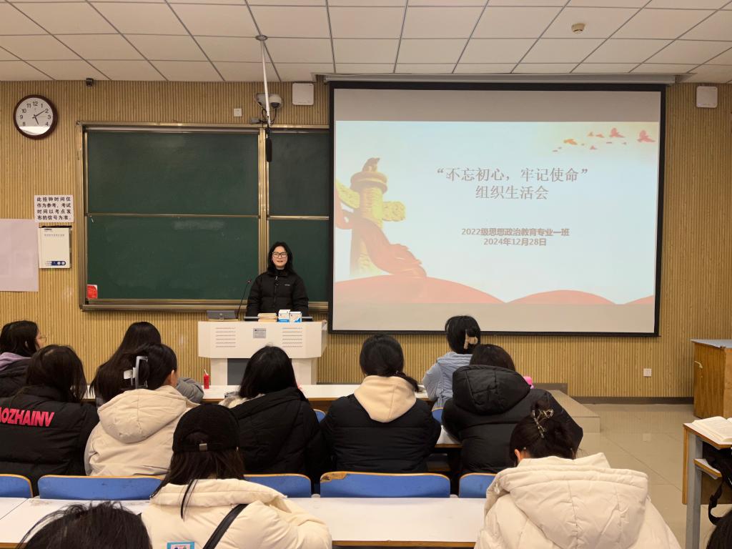 12月28日下午,金年会jinnianhuicom2022级思想政治教育一班在社科楼515教室召开“不忘初心,牢记使命”组织生活会。金年会官网2022级思想政治教育一班全体同学共同参与本次会议,会议由团支书李佳茹主持。