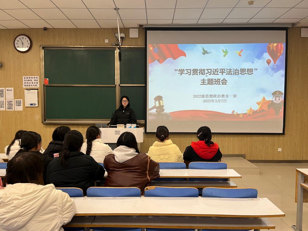 为深入学习贯彻习近平法治思想、全面贯彻党的二十大精神,切实推动学习贯彻习近平法治思想走深走实,3月7日下午,金年会jinnianhuicom2022级思想政治教育一班在社科楼515教室开展“学习贯彻习近平法治思想”主题班会,金年会官网2022级思想政治教育一班全体同学共同参与本次班会,班会由团支书李佳茹主持。