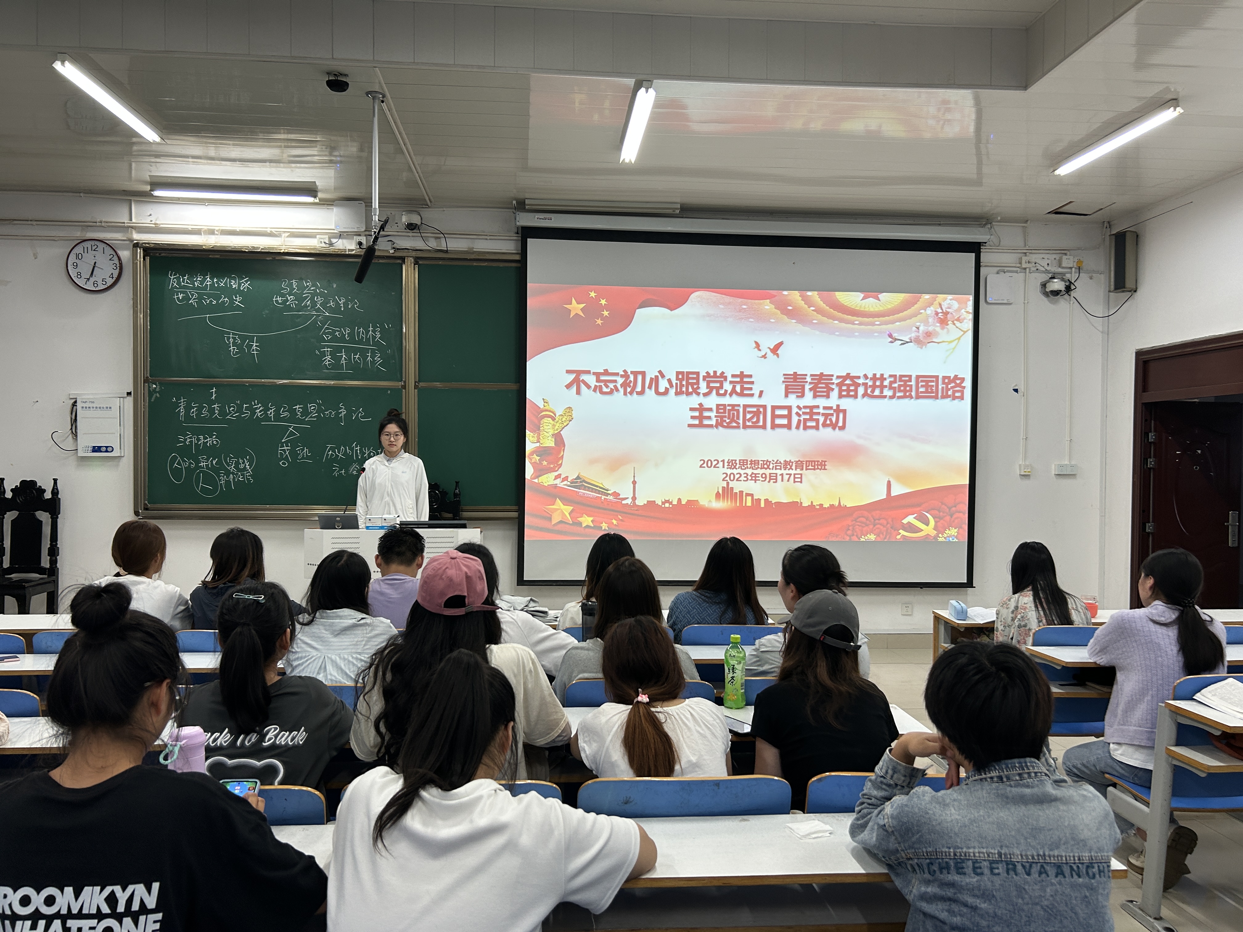 9月17日下午,金年会jinnianhuicom2021级思想政治教育四班在社科楼515教室召开“不忘初心跟党走,青春奋进强国路”主题团日活动。2021级思想政治教育四班全体团员共同参加本次团课。团课由团支书刘珂含主持。