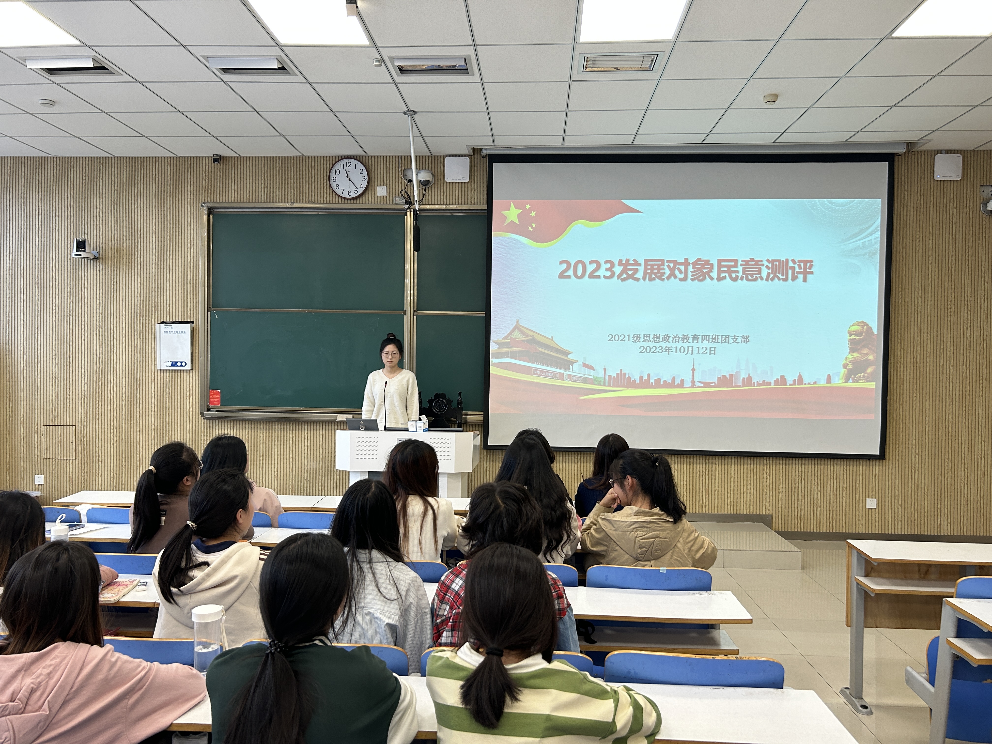 10月12日下午,金年会jinnianhuicom2021级思想政治教育四班在社科楼514教室召开2023年发展对象民意测评会。2021级思想政治教育四班全体团员共同参会。会议由团支书刘珂含主持。