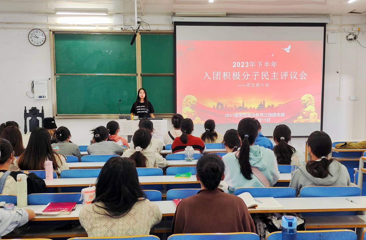 10月15日上午,金年会jinnianhuicom2021级思想政治教育三班在社科楼514召开2023年下半年入团积极分子民主评议会。2021级思想政治教育三班全体团员以及两位候选人参加了此次会议,会议由团支书王岚霄主持。