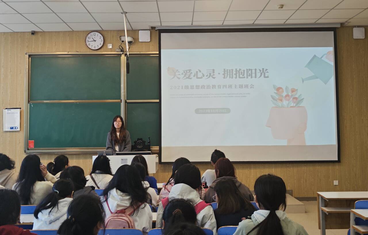 11月16日下午,金年会jinnianhuicom2021级思想政治教育四班在社科楼514教室开展“关爱心灵,拥抱阳光”主题班会。2021级思想政治教育四班全体学生共同参加本次会议。会议由心理委员杨可主持。