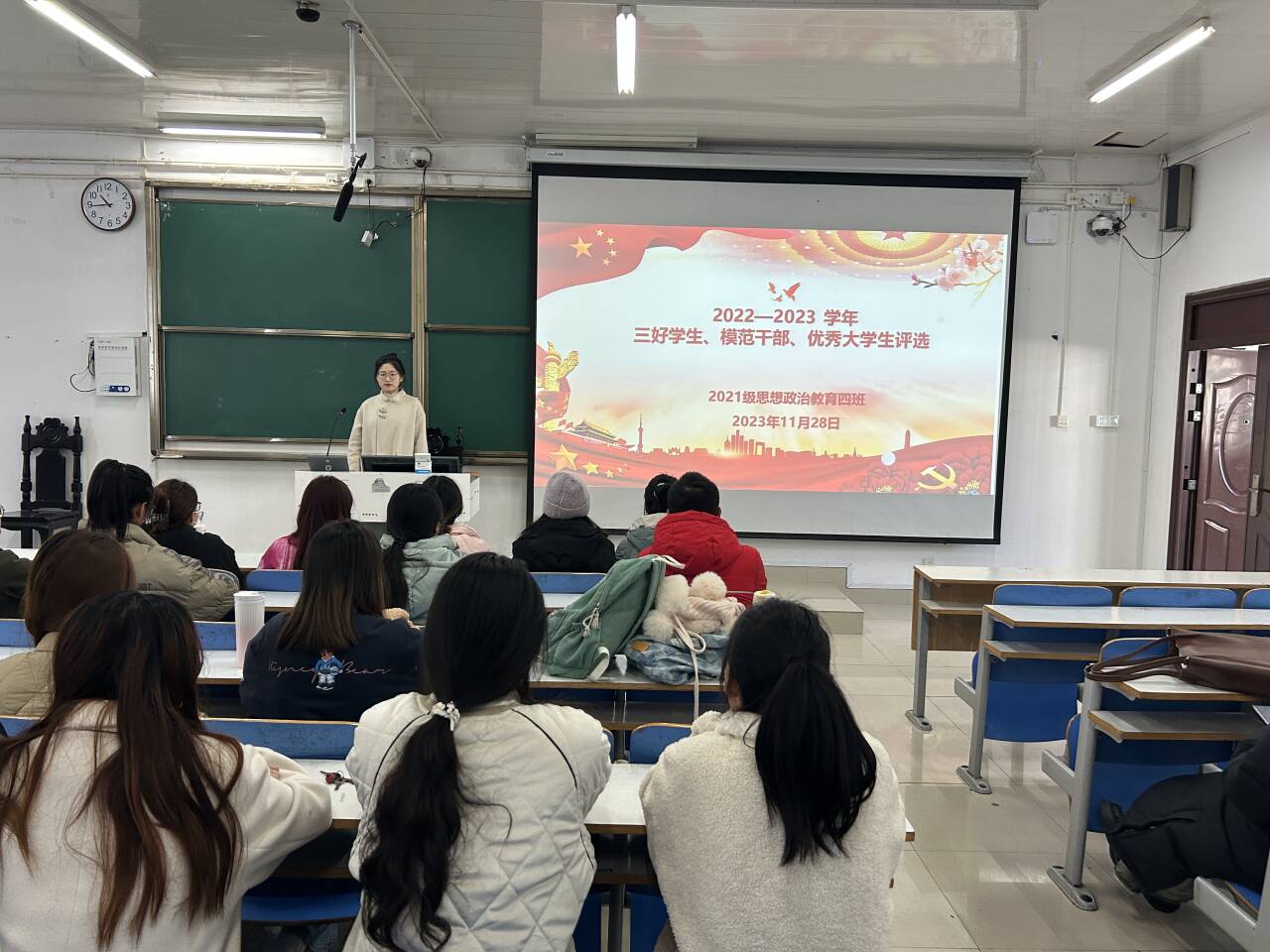 11月28日上午,金年会jinnianhuicom2021级思想政治教育四班在社科楼515教室开展2022-2023学年“三好学生、模范干部、优秀大学生”评选会。思想政治教育四班全体同学参加本次会议。会议由团支书刘珂含主持。