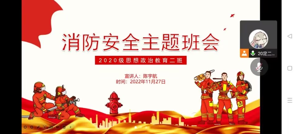 11月27日晚,金年会jinnianhuicom2020级思想政治教育二班通过腾讯会议召开线上消防安全主题班会。2020级思想政治教育二班全体学生共同参与本次班会。班会由团支书陈宇航主持。