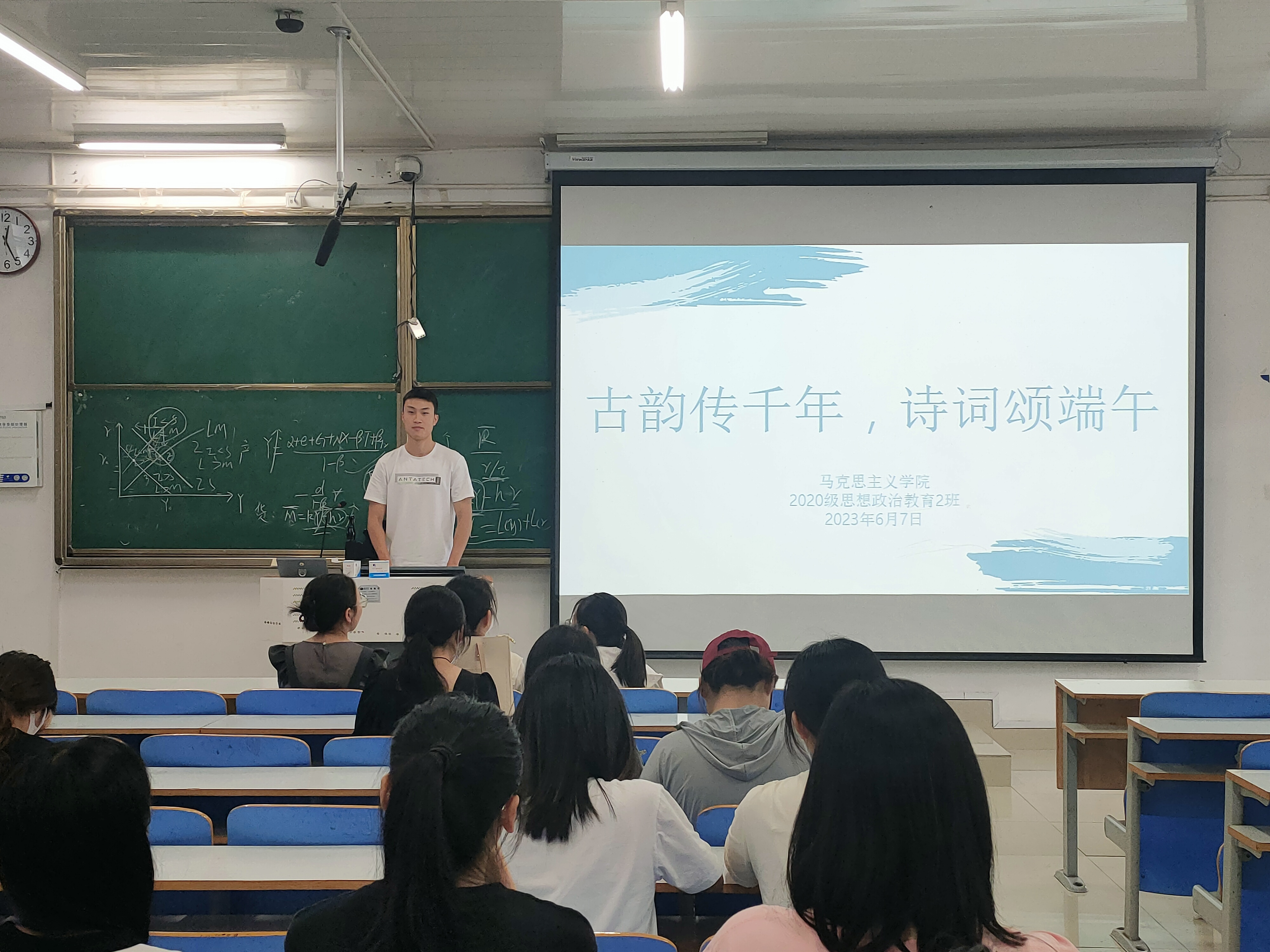 为增进我班同学对中华优秀传统文化的了解,进一步厚植文化自信,6月7日上午,金年会jinnianhuicom2020级思想政治教育二班、定向二班在社科楼514教室开展“古韵传千年,诗词颂端午”主题团课。二班、定向二班全体同学共同参与本次团课。团课由团支书陈宇航主持。