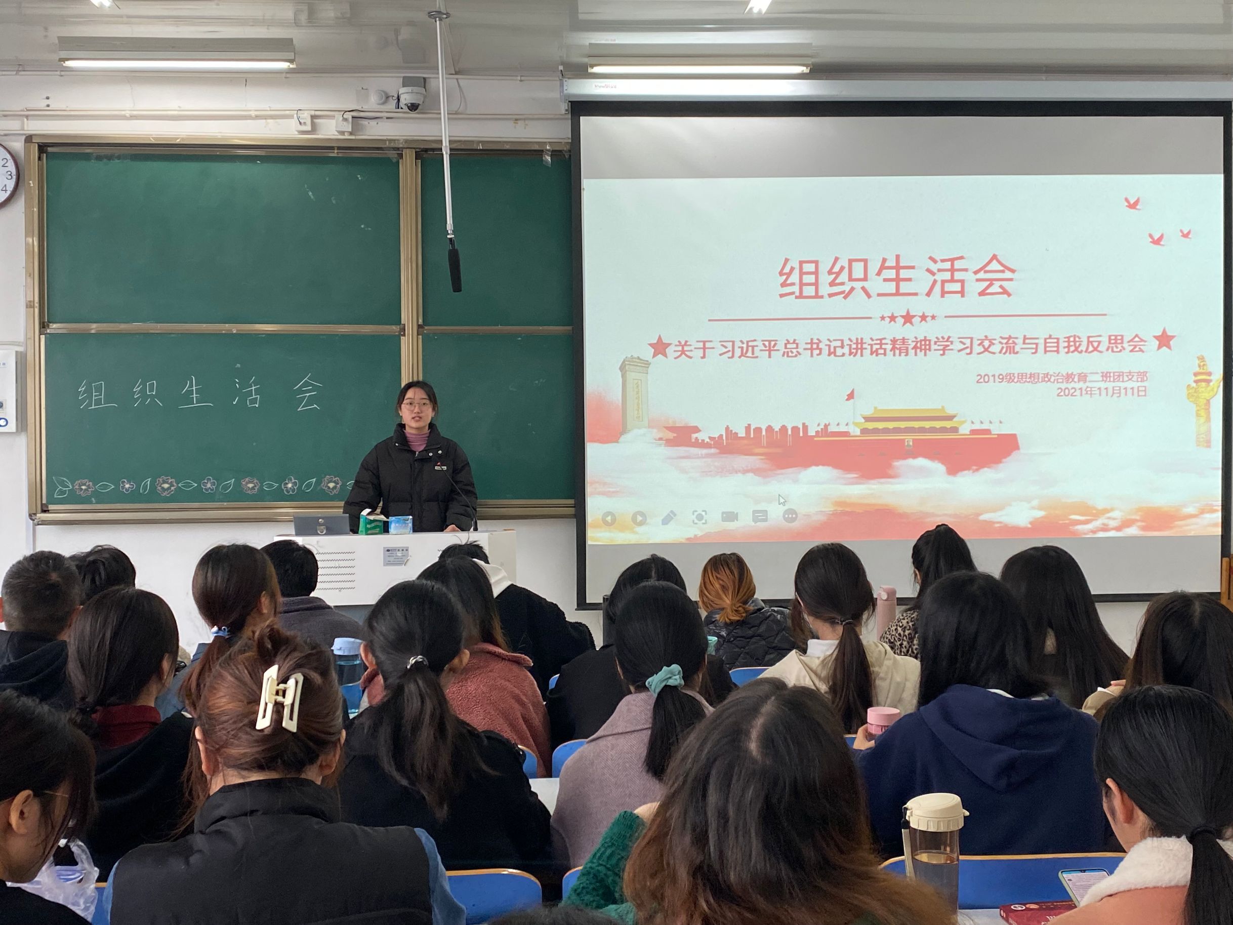 为贯彻落实全团“学党史、强信念、跟党走”学习教育部署,强化广大团员的使命担当,11月11日上午,金年会官网2019级思想政治教育二班于社科楼516教室召开关于习近平总书记讲话精神学习交流与自我反思专题组织生活会。2019级思想政治教育二班辅导员陶青青以及全体学生共同参会。会议由团支书孙雅娴主持。