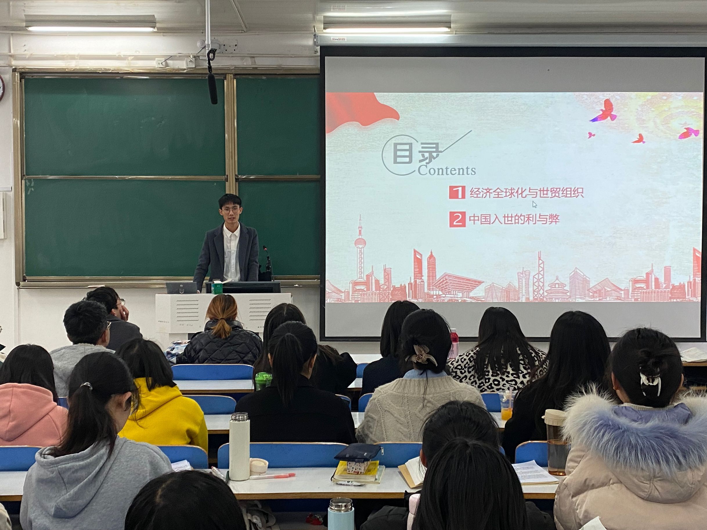 今年是中国加入世贸组织20年。这20年既是中国经济快速发展、人民生活水平显著改善的20年,也是中国与世界深度融合、共享机遇、共同成长的20年。首先,王明亮以一批浸满时光记忆的照片、视频为着眼点,生动展现“复关”、“入世”的谈判历程,以及过去20年,特别是党的十八大以来,在党中央坚强领导下,我国履行加入WTO承诺、支持多边主义、参与WTO改革的重大事件和历史瞬间,详细解说了中国这一路走来的艰辛历程。接着,他强调中国“入世”的20年以来始终坚持将享有权利与履行义务相结合,将实现自身发展与促进世界共同发展相结合,将参与国际经贸合作与推动全球经济治理变革相结合,在2010年就已全部履行加入世贸组织的承诺,在多方面作出超额贡献,向世界交上了一份“A+”答卷。最后,王明亮以中国“入世”的利与弊为切入点,切实分析当前应对“入世”之弊的可行措施,呼吁同学们铭记中国“入世”的历史事实,增强民族自信,培育忧患意识,辩证的看待世贸组织所带来的“双刃”影响。