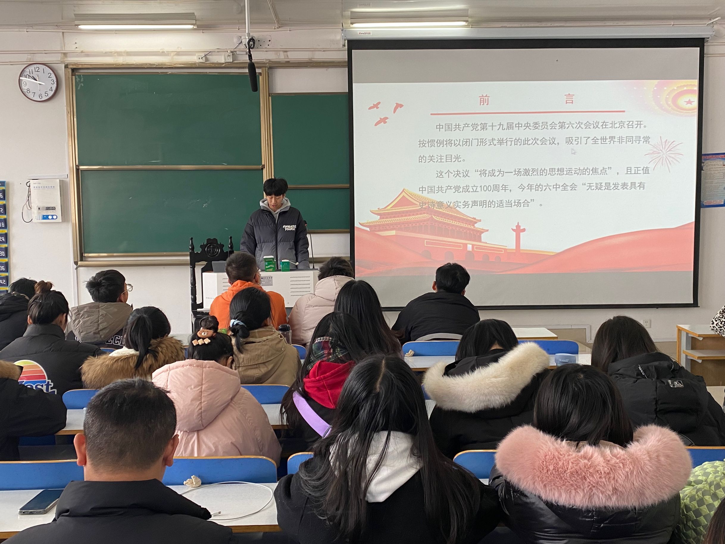 团课伊始,吕昂从“十九届六中全会主要议程”、“《中共中央关于党的百年奋斗重大成就和历史经验的决议》的重要性”、“回答了两个重大问题”和“学习十九届六中全会精神感悟”四个方面对团课内容展开讲授。接着,吕昂从“看清楚过去”和“弄明白未来”两方面展开深入解析,引导同学们学习党的百年奋斗史,思考“中国共产党为什么能够成功?怎样才能继续成功?”,帮助同学们学深学透十九届六中全会精神。最后,他着重讲解了《中共中央关于党的百年奋斗重大成就和历史经验的决议》的重要性,他指出,会议通过的决议是我们党高举旗帜、以史为鉴、开创未来的政治宣言书和时代动员令。作为新时代青年,应当坚定不移听党话,矢志不渝跟党走,志存高远,勇立潮头,将远大的理想抱负与实际学习相结合,努力学习本领,发掘潜能、在新的征程中勇于担当、积极奉献,为实现中国特色社会现代化强国的中国梦贡献青春力量。