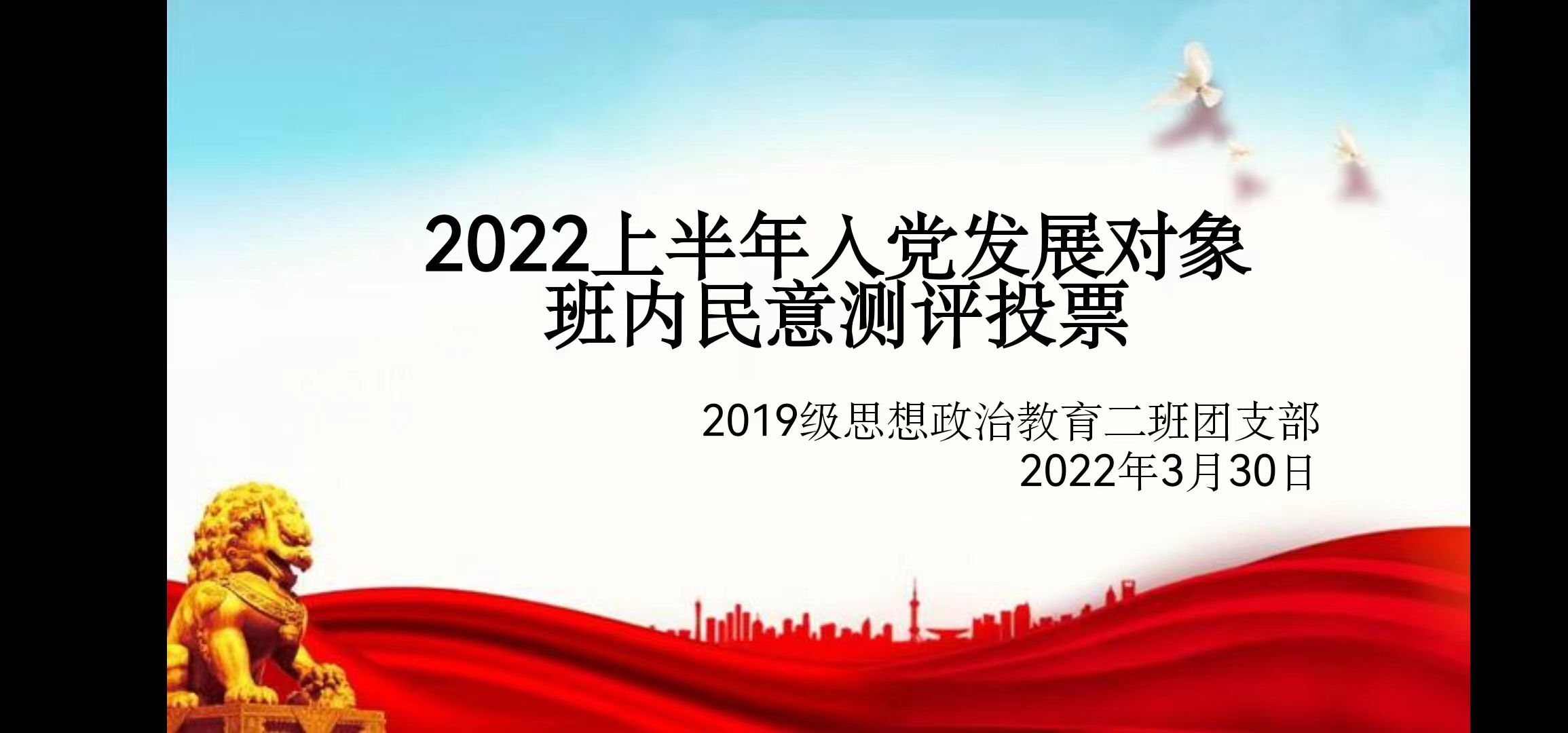 3月30日下午,金年会jinnianhuicom2019级思想政治教育二班团支部“ 2022年上半年入党发展对象班内民意测评投票”活动于社科楼514教室顺利开展。2019级思想政治教育二班全体成员共同参会。本次会议由团支书孙雅娴主持。
