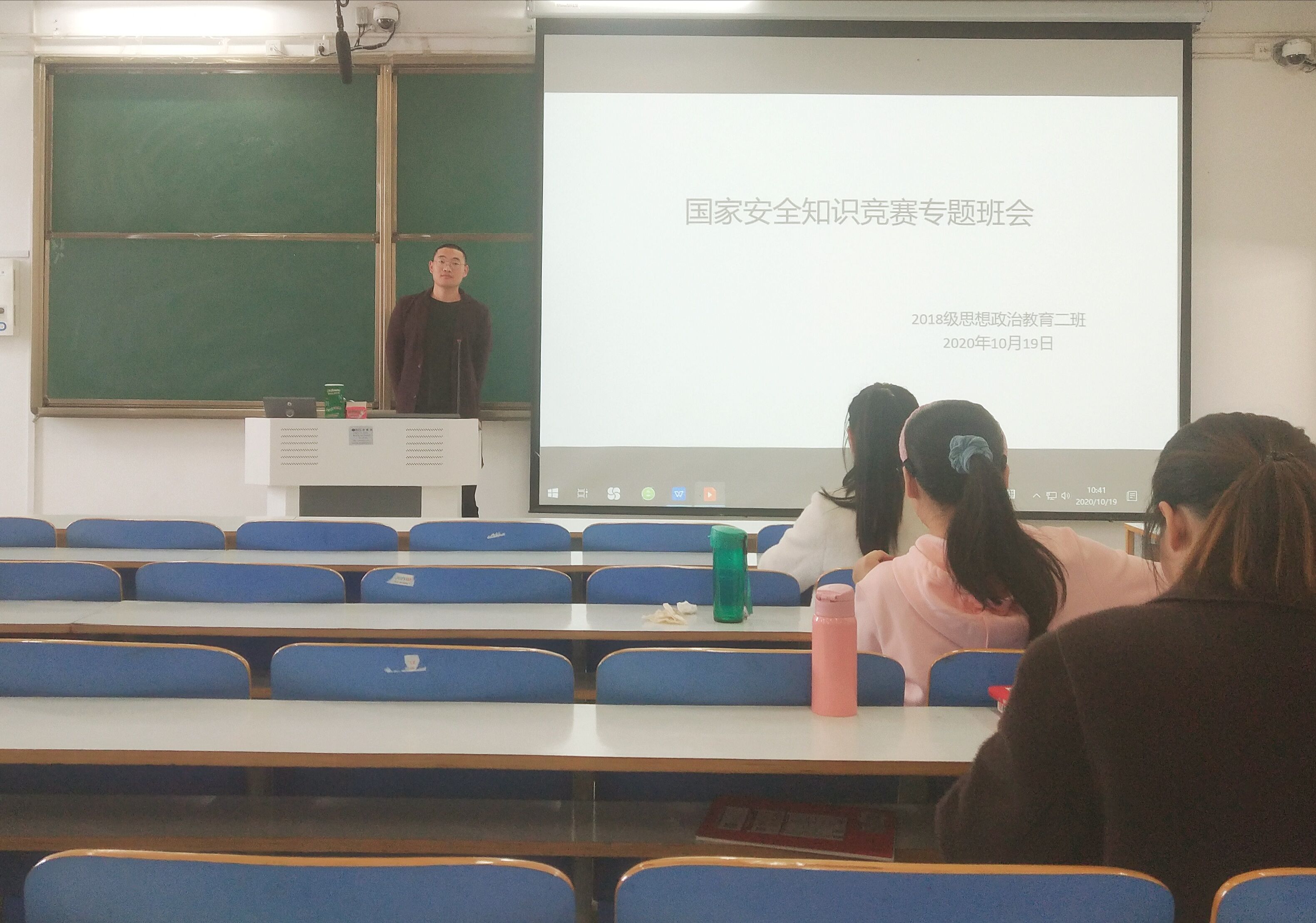 10月19日上午,金年会官网2018级思想政治教育二班在社科楼514教室顺利开展“国防安全知识竞赛”专题班会。2018级思想政治教育二班全体成员共同参加了此次班会。会议由班长杨康主持。