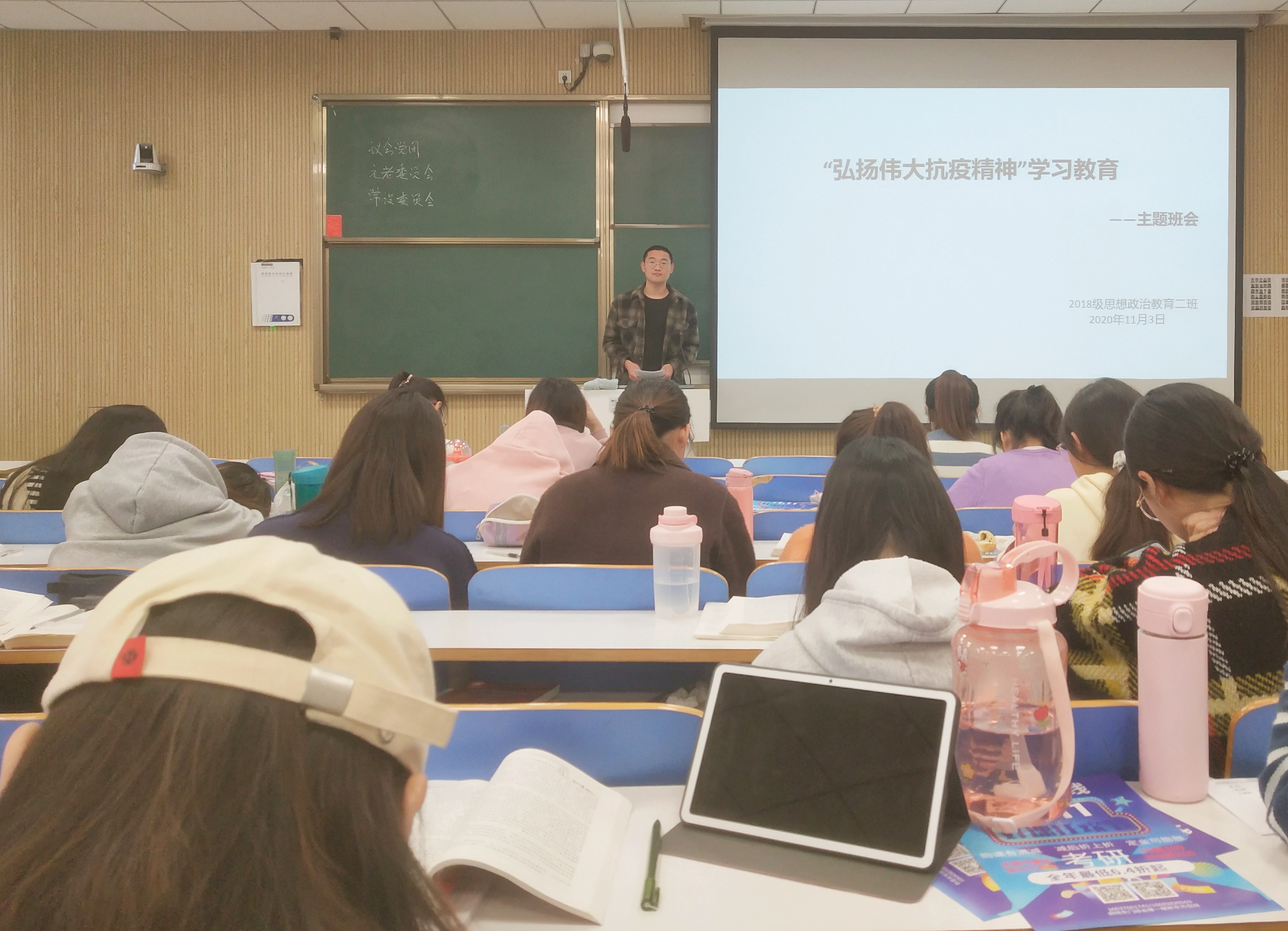 11月3日上午,金年会官网2018级思想政治教育二班在社科楼515教室顺利开展主题为“弘扬伟大抗疫精神”学习教育主题班会。会议由班长杨康主持。
