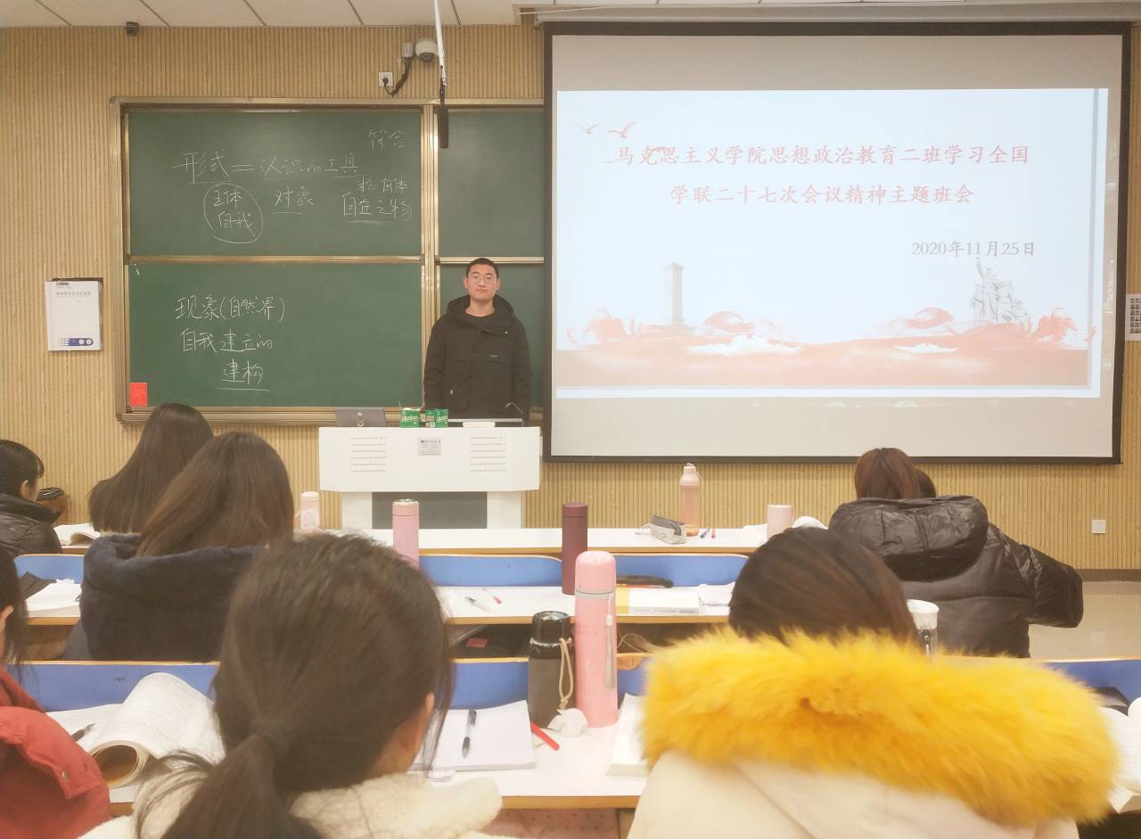 11月25日上午,金年会jinnianhuicom2018级思想政治教育二班在社科楼515教室顺利开展学习中华全国学生联合会第二十七次代表大会精神主题班会。会议由班长杨康主持。