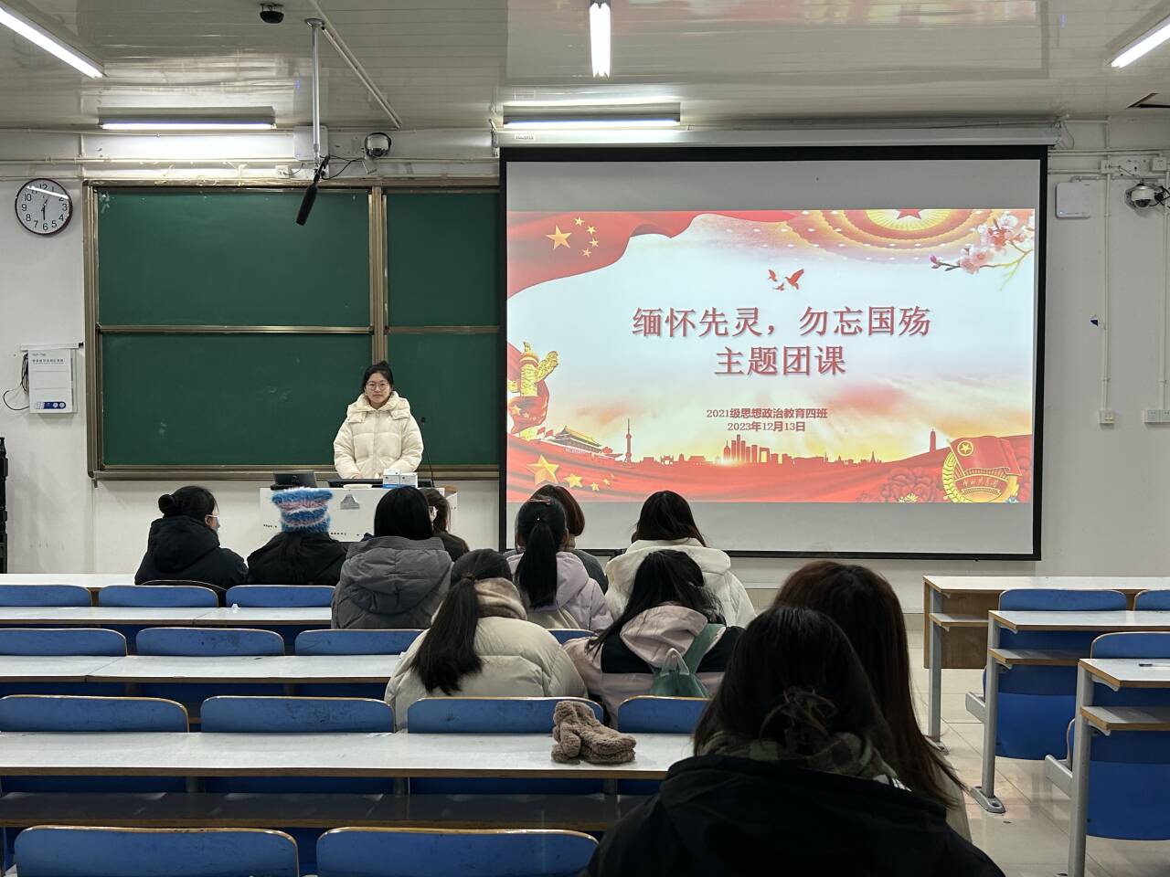 12月13日下午,金年会jinnianhuicom2021级恩想政治教育四班在社科楼514教室开展“缅怀先灵,勿忘国殇”主题团课。2021级思想政治教育四班全体团员参加本次团课。团课由团支书刘珂含主持。
