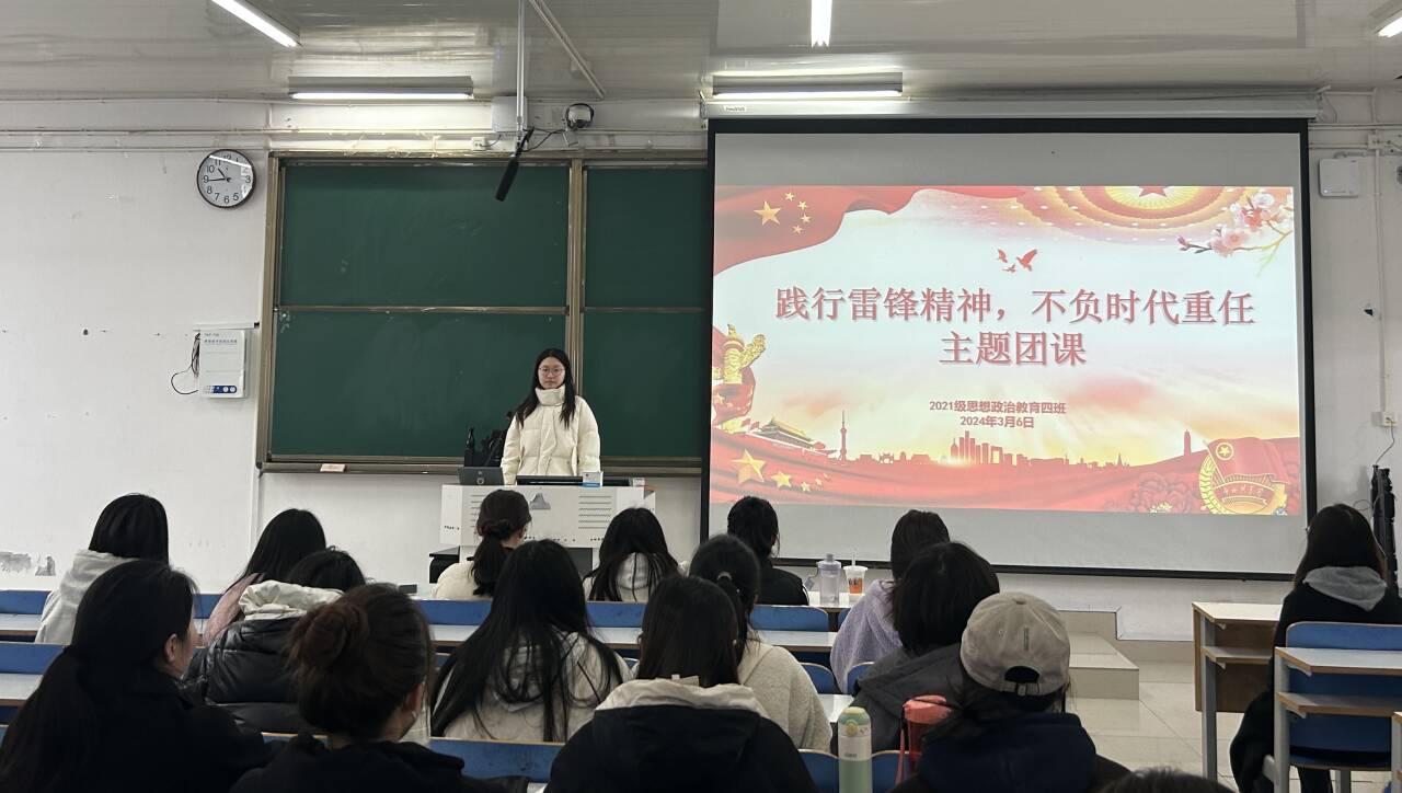 为大力弘扬雷锋精神,传承雷锋艰苦朴素的优良作风,3月6日上午,金年会jinnianhuicom2021级思想政治教育四班在社科楼514教室开展“践行雷锋精神,不负时代重任”主题团课。2021级思想政治教育四班全体成员共同参加本次团课,团课由团支书刘珂含主持。