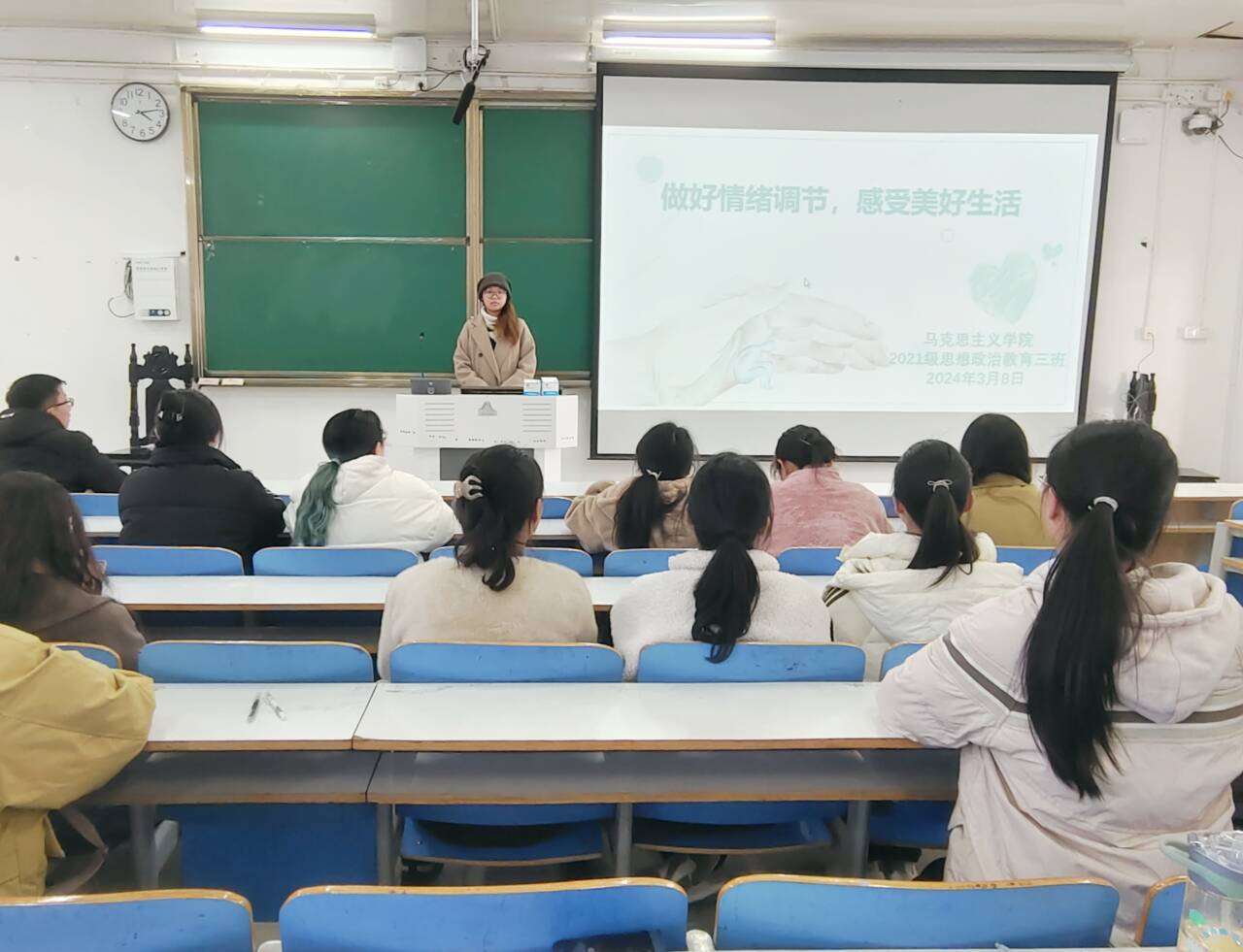 3月8日下午,金年会jinnianhuicom2021级思想政治教育三班在社科楼514教室举办“做好情绪调节,感受美好生活”主题团课。2021级思想政治教育三班全体成员参加了此次会议。会议由心理委员许竞文主持。