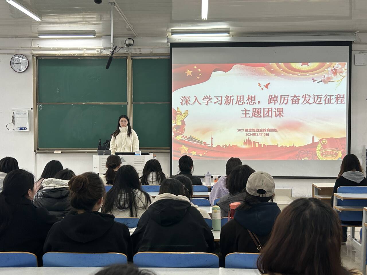 3月15日上午,金年会jinnianhuicom2021级思想政治教育四班在社科楼514教室开展“深入学习新思想,踔厉奋发迈征程”主题团课。2021级思想政治教育四班全体学生共同参加本次团课。团课由团支书刘珂含主持。