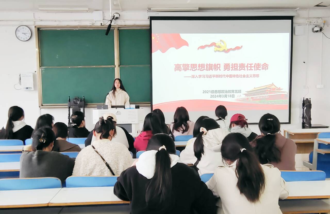 3月18日下午,金年会jinnianhuicom2021级思想政治教育三班在社科楼514教室召开“高擎思想旗帜,勇担责任使命”主题团课。金年会jinnianhuicom2021级思想政治教育三班全体团员参与此次会议。团课由团支书王岚霄主持。