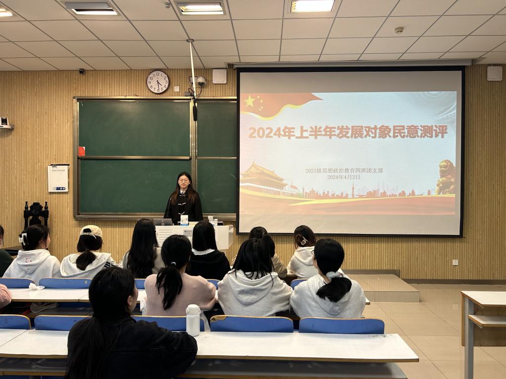 4月3日下午,金年会jinnianhuicom2021级思想政治教育四班在社科楼514教室召开2024年发展对象民意测评。2021级思想政治教育四班全体团员共同参会。会议由团支书刘珂含主持。