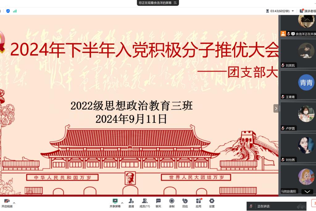9月11日晚,金年会jinnianhuicom2022级思想政治教育三班在线上腾讯会议召开入党积极分子推优大会。金年会官网2022级思想政治教育三班班主任任婷与班级全体团员共同参加此次大会。大会由团支书余浩洋主持。