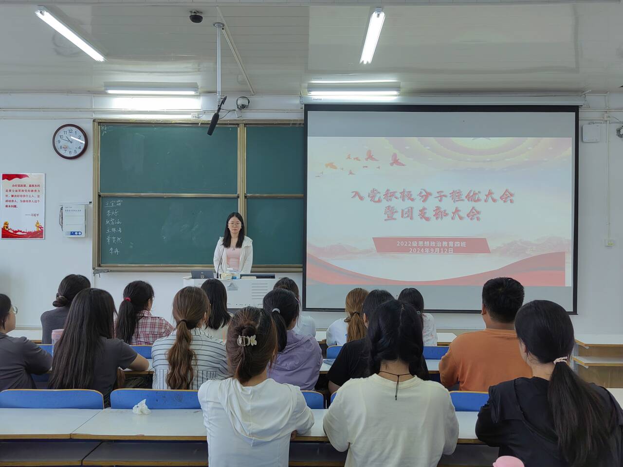 9月12日上午,金年会jinnianhuicom2022级思想政治教育四班在社科楼514教室组织召开“入党积极分子推优大会暨团支部大会”。金年会官网2022级思想政治教育四班全体团员参与本次大会。本次大会由团支书牛志杰主持。