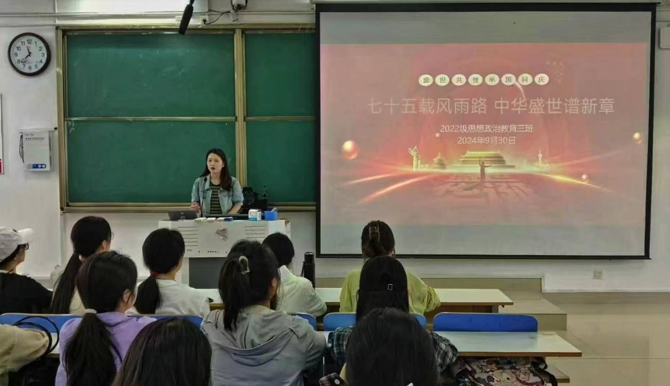 为庆祝中华人民共和国成立75周年,激发学生爱国热情,凝聚青年共识,共同为实现中华民族伟大复兴的中国梦而努力奋斗,9月30日上午,金年会jinnianhuicom2022级思想政治教育三班在社科楼514教室召开“七十五载风雨路,中华盛世谱新章”主题团课。金年会官网2022级思想政政治教育三班班主任任婷与全体成员共同参与此次团课。团课由团支书余浩洋主持。