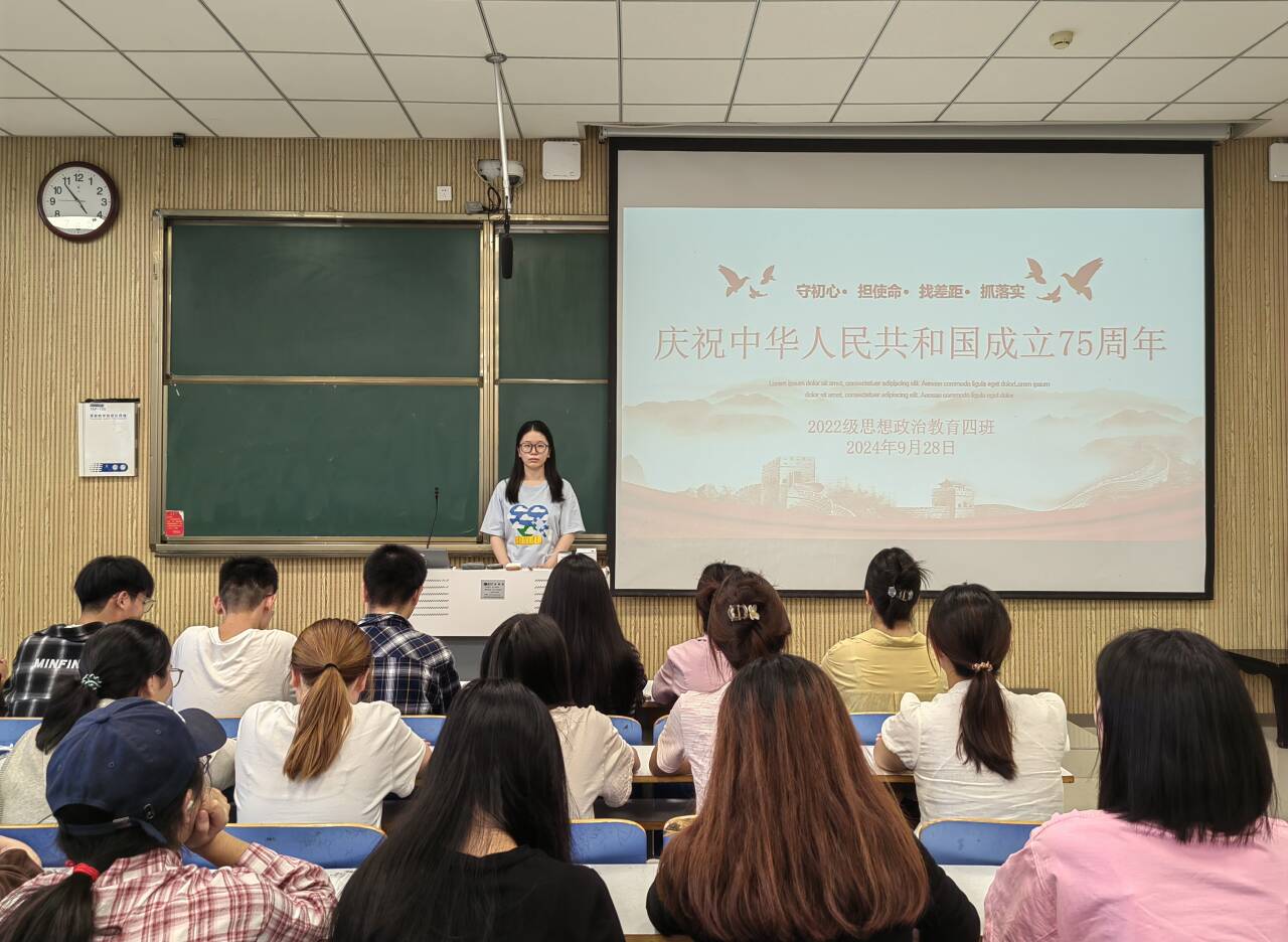 为激发学生们的爱国主义情怀和民族自豪感,弘扬民族精神,庆祝中华人民共和国成立75周年,教育引导广大学生当好红色基因的传承者、实践者,9月28日上午,金年会jinnianhuicom2022级思想政治教育四班在社科楼515教室组织召开“庆祝中华人民共和国成立75周年”主题班会。金年会官网2022级思想政治教育四班全体成员参与本次班会。本次班会由班长牛志杰主持。