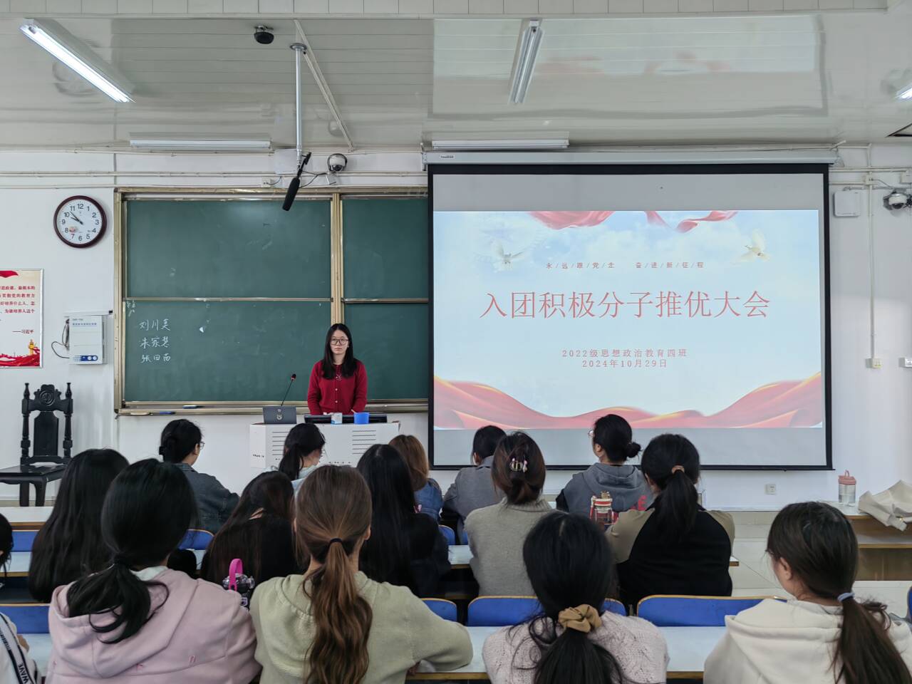 会议伊始,牛志杰向同学们介绍了共青团的光辉历史和重要地位,强调了共青团作为党的助手和后备军的重要作用。接着,她又详细说明了入团的条件和程序,鼓励同学们积极向团组织靠拢,争取早日成为一名光荣的共青团员。三位候选人纷纷登台亮相,用饱满的热情和真挚的言语,向同学们表达了自己想要成为入团积极分子的决心并且表达了自己对团组织的热情和向往,传递了积极向上的价值观和正能量。最后,牛志杰强调,共青团是中国青年的先进组织,是中国共产党的有力助手和后备军,是培养和造就“四有”青年的革命熔炉,作为新时代青年的我们,也应积极地加入共青团当中,为社会贡献自己的一份力量。