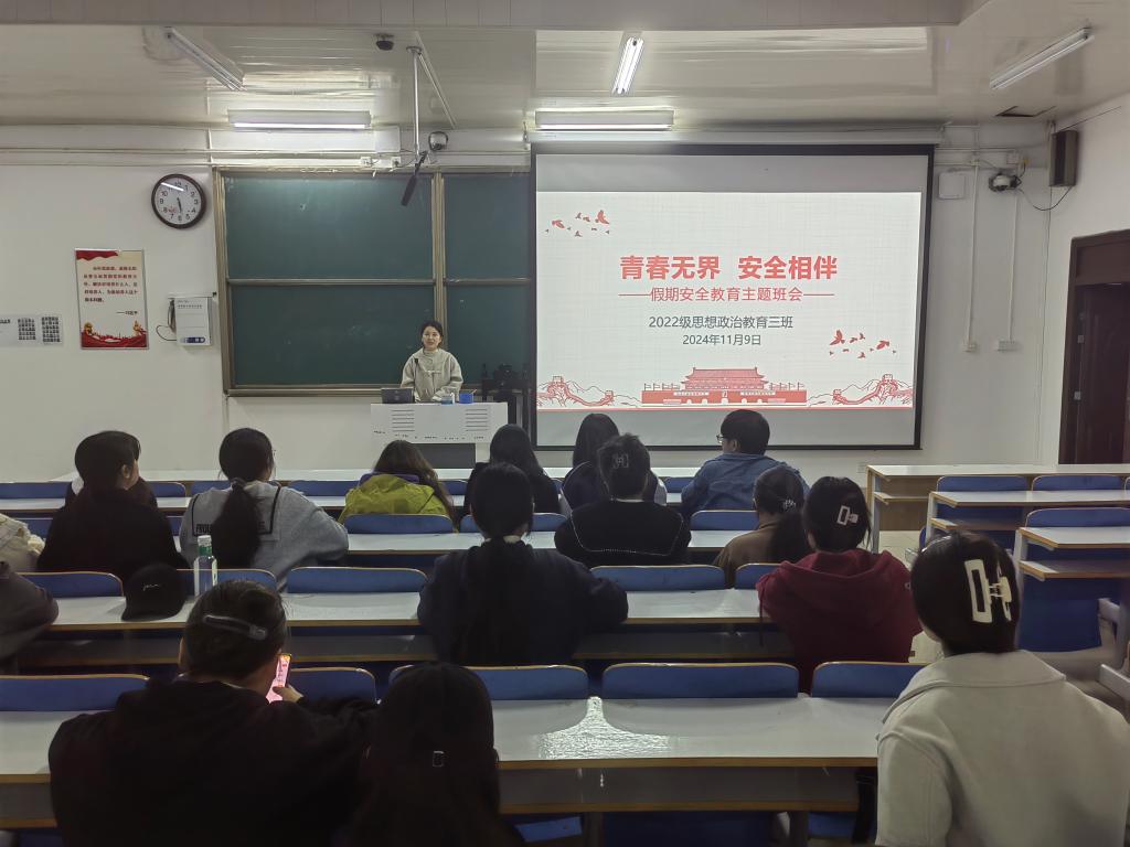 为进一步增强同学们的安全意识,提高防范意识,11月9日下午,金年会jinnianhuicom2022级思想政治教育三班在社科楼514教室召开“青春无界,安全相伴”安全教育主题班会。金年会官网2022级思想政治教育三班班主任任婷和三班全体成员共同参与此次班会。班会由任婷主持。
