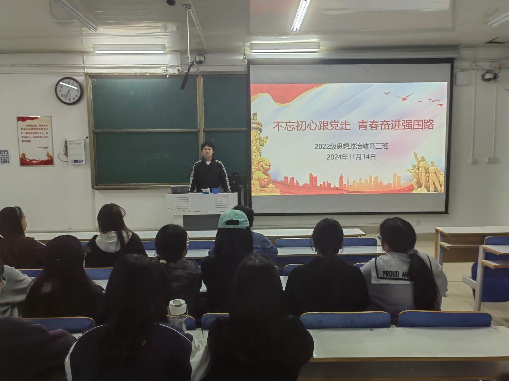 11月14日下午,金年会jinnianhuicom2022级思想政治教育三班在社科楼514教室开展“不忘初心跟党走,青春奋进强国路”主题团课。金年会官网2022级思想政治教育三班全体成员共同参加此次团课,团课由团支书余浩洋主持。