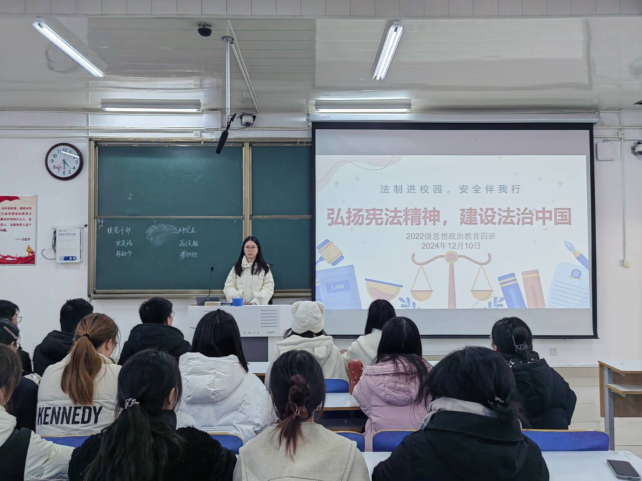 为了加深学生对宪法的认识,引导学生树立正确的法治观念,12月10日上午,金年会jinnianhuicom2022级思想政治教育四班在社科楼514教室组织召开“弘扬宪法精神,建设法治中国”主题班会。金年会官网2022级思想政治教育四班全体成员参与本次班会。本次班会由班长牛志杰主持。