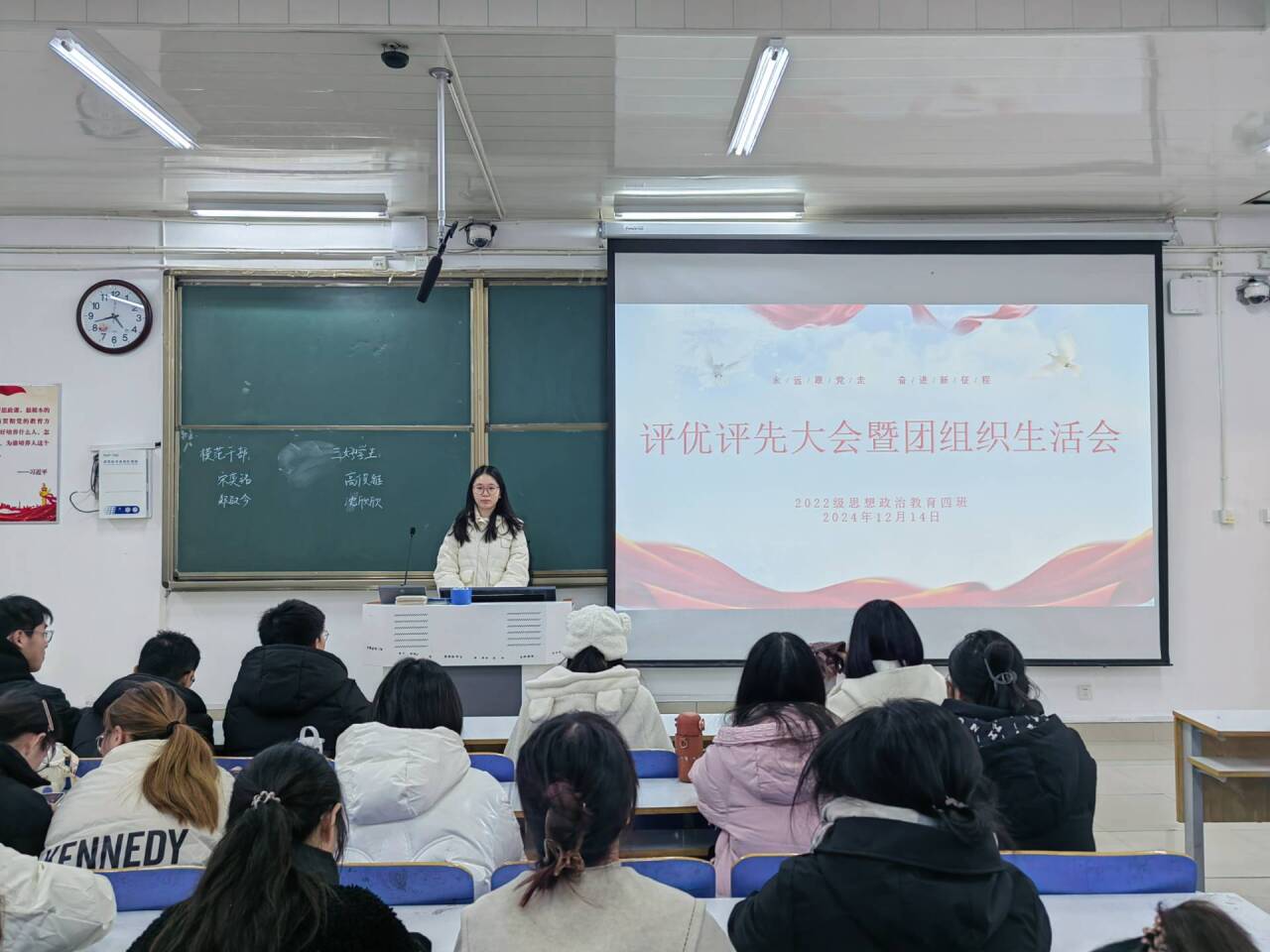 12月14日下午,金年会jinnianhuicom2022级思想政治教育四班在社科楼514教室组织召开“评优评先大会暨团组织生活会”。金年会官网2022级思想政治教育四班全体成员参与本次班会。本次班会由班长牛志杰主持。