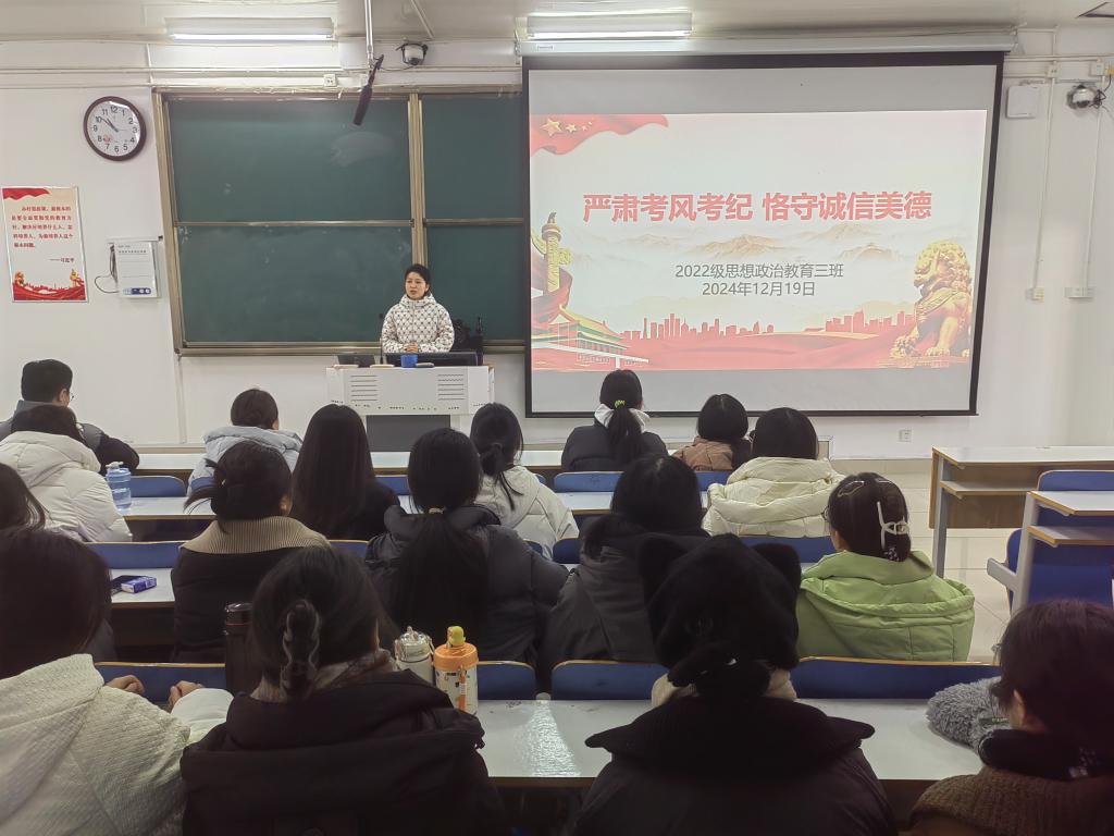 12月19日上午,金年会jinnianhuicom2022级思想政治教育三班在社科楼514教室召开“严肃考风考纪,恪守诚信美德”主题班会。金年会官网2022级思想政治教育三班全体成员共同参与此次班会,班会由班主任任婷主持。