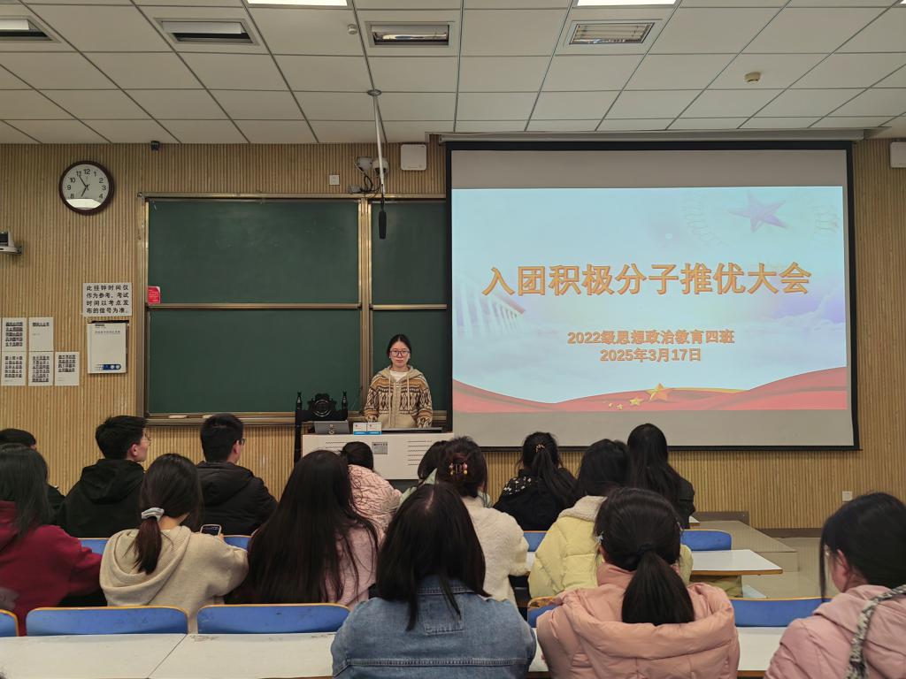 3月17日下午,金年会jinnianhuicom2022级思想政治教育四班在社科楼515教室组织召开“入团积极分子推优大会”主题班会。金年会官网2022级思想政治教育四班全体成员参与本次班会。本次班会由班长牛志杰主持。