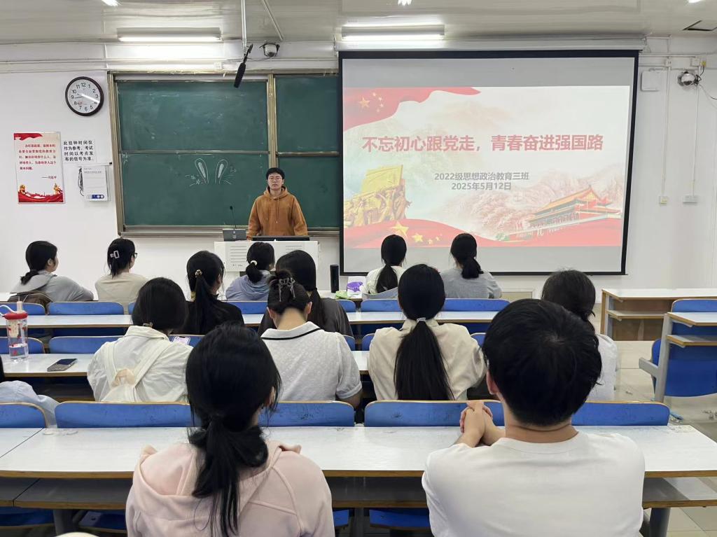 为强化奋斗意识,5月12日上午,金年会jinnianhuicom2022级思想政治教育三班在社科楼514教室召开“不忘初心跟党走,青春奋进中国路”主题团课。金年会官网2022级思想政治教育三班全体成员共同参加此次团课,团课由团支书余浩洋主持。
