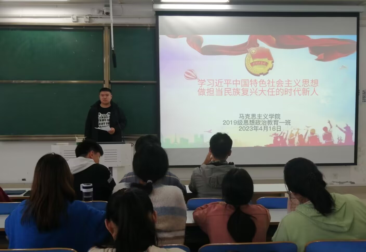 4月16日上午,金年会jinnianhuicom2019级思想政治教育一班在社科楼515教室开展“学习近平新时代中国特色社会主义思想,做担当民族复兴大任的时代新人”主题团课。金年会jinnianhuicom2019级思想政治教育全体成员参加本次会议,会议由班长贾子漪主持。