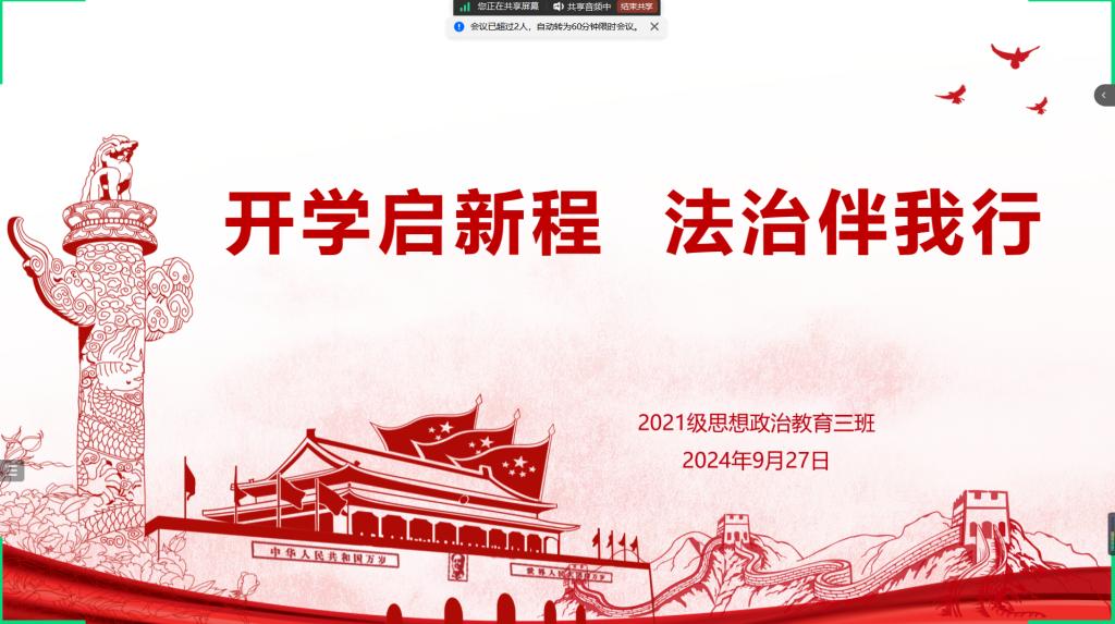 9月27上午,金年会jinnianhuicom2021级思想政治教育三班在线上召开“开学启新程,法治伴我行”主题班会。2021级思想政治教育三班全体成员参与此次会议。会议由副班长易从漫主持。