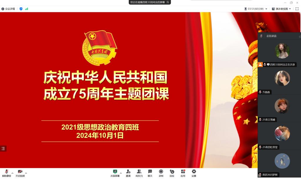 10月1日上午,金年会jinnianhuicom2021级思想政治教育四班在腾讯会议开展“庆祝中华人民共和国成立75周年”主题团课。2021级思想政治教育四班全体同学参加本次团课。团课由团支书刘珂含主持。