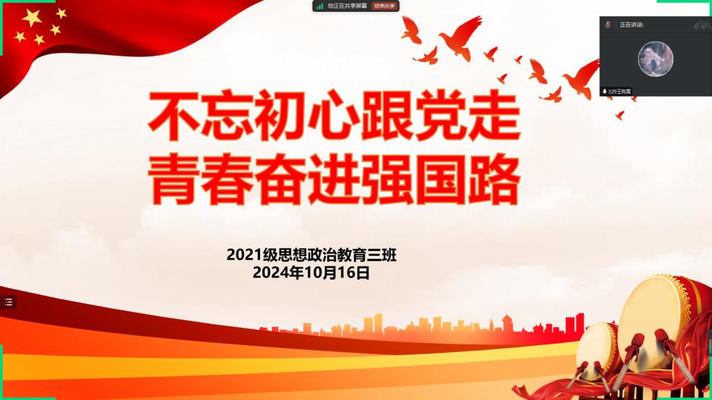 10月16日上午,金年会jinnianhuicom2021级思想政治教育三班在线上召开“不忘初心跟党走,青春奋进强国路”主题团课。金年会jinnianhuicom2021级思想政治教育三班全体团员参与此次团课。团课由团支书王岚霄主持。